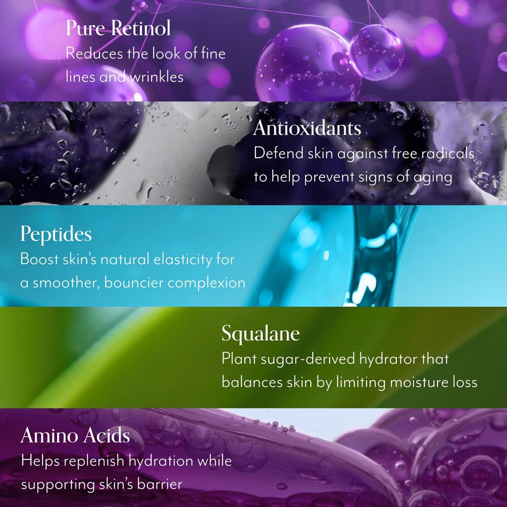 This silky moisturizer powered by pure retinol visibly diminishes fine lines and counteracts environmental damage – all while delivering intense hydration.